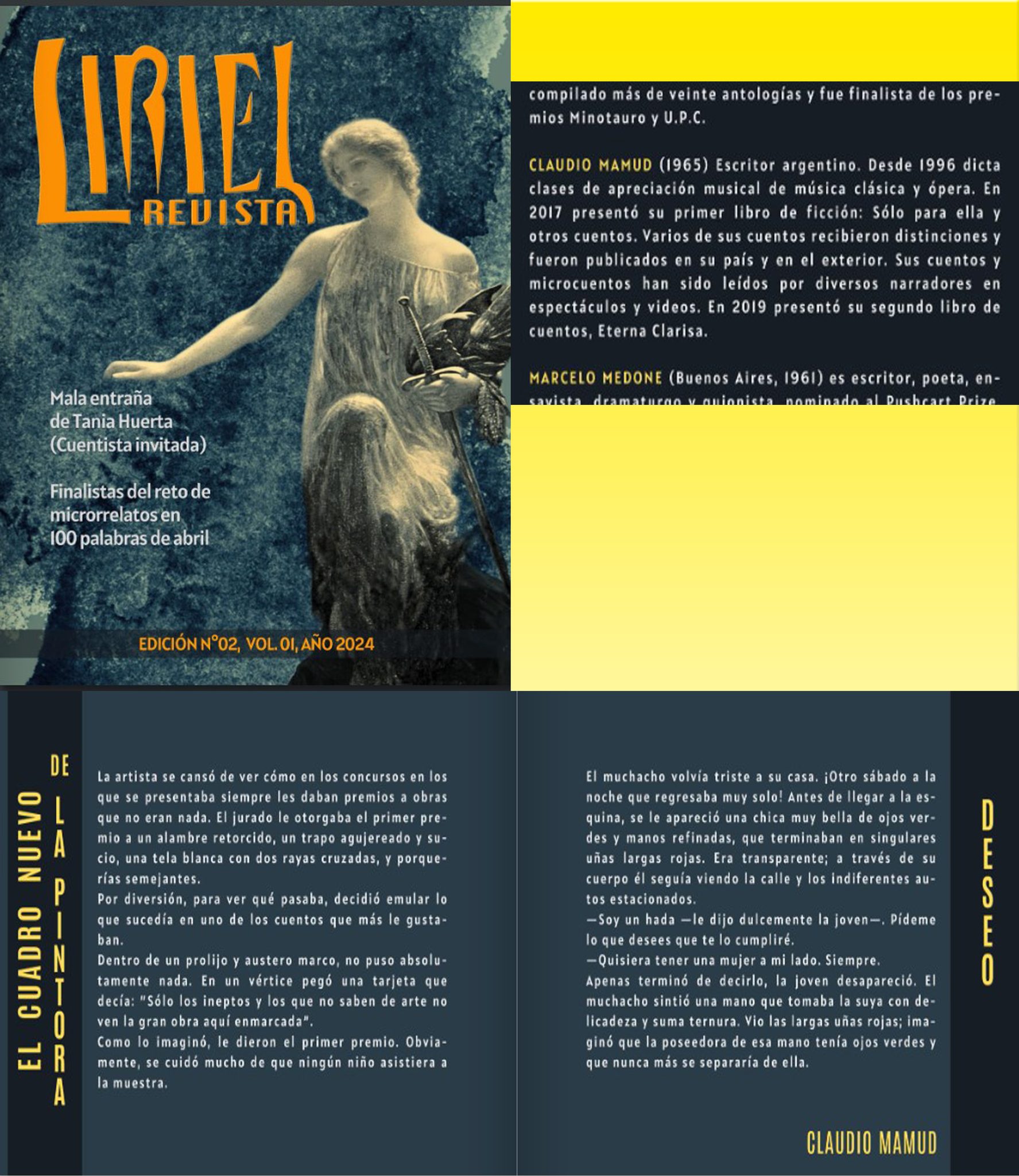 Sus microcuentos Deseo y El cuadro nuevo de la pintora fueron publicados por la Revista Literaria «Liriel», de Chile.